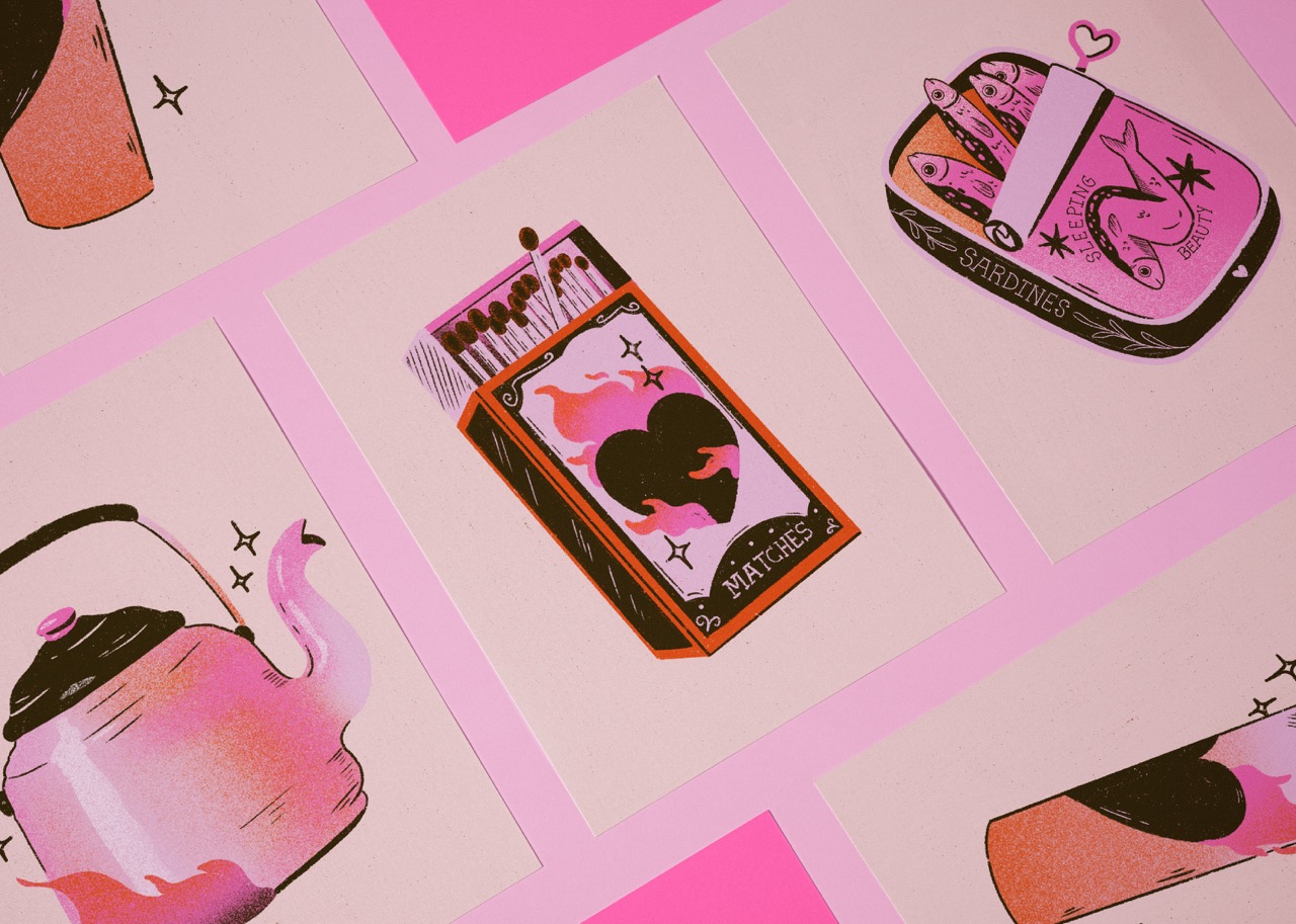 Para estudar formas de trabalhar com texturas em minhas ilustrações, ilustrei 4 objetos que encontrei em minha cozinha, mas claro, dando um toque que combinasse com o meu estilo: vibrante, divertido e super rosa!